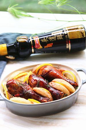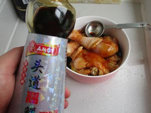 鸡腿洗净吸干水分后加入黄酒和生姜抓匀再加入生抽和老抽抓匀盖上进冰箱冷藏8小时以上