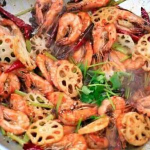 3.葱姜蒜炸透,下入红油辣酱、干辣椒,翻炒出香味烧至六七成热时,放入虾,盖盖炸约1分钟,煸至外焦里嫩。