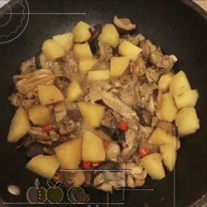热锅下油,放入小红辣椒、姜蒜爆香,放入鸡翻炒至变黄后倒入蘑菇,调入盐、酱油继续翻炒5到10分钟,然后倒入清水(倒入泡香菇水)没过鸡,盖锅,中火闷1小时;鸡闷得差不多的时候放入土豆继续盖锅闷至土豆熟,这时候鸡也闷得软烂入味,可以出锅上桌啦!