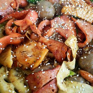 全都备齐后,锅内加适量油,温热后加入葱姜蒜,焦黄后捞出!加入素菜翻炒一下放入调料,待调料块完全化开倒入牛肉丸、亲亲肠,培根和鸡翅快速翻炒!(觉得味道不足可额外加食盐或者炸油时放入干辣椒)出锅时撒些芝麻或者香菜!