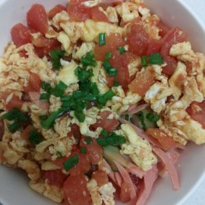 先盛面,可以放一些火腿,最后倒入西红柿鸡蛋,撒上葱花,完美