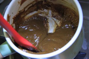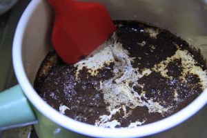 然后小火加热,至砂糖和麦芽糖都全部融化,咖啡粉也全部溶解。记得要用耐高温的刮刀不停的搅拌以免糊底。