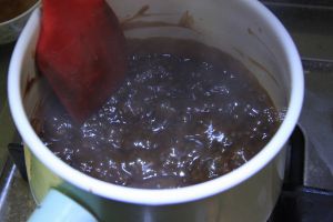 用小火一直加热到锅内的液体开始沸腾冒泡,还是要用刮刀不停的搅拌,液体会越来越粘稠的,如果不搅拌就会糊底的。