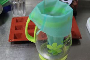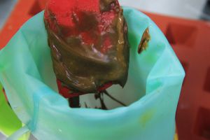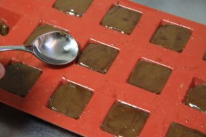 奶锅关火以后,迅速倒入硅胶袋中。如果没有硅胶裱花袋就用勺子往模具里舀吧。趁热将糖浆倒入硅胶模具中,因为糖浆比较烫,拿裱花袋时最好带着隔热手套来操作。你也可以用勺子来舀糖浆倒入,但动作要快,糖浆一凝固就不好操作了。