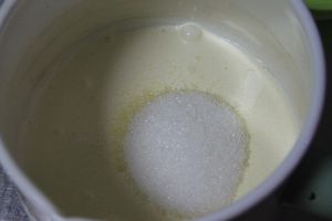 最后倒入淡奶油,用刮刀稍微拌匀。