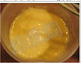全蛋加糖用打蛋器由慢到快打到蛋液颜色变浅至乳白色,捞起蛋糊呈线条状,滴落不会立刻消失,再慢速打1分钟
