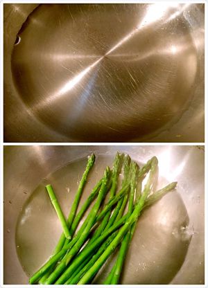 接着制作蔬菜,清水里加入1克盐,水开后放入芦笋,20秒后盛出备用。