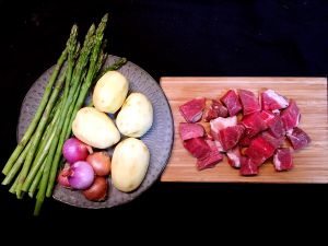 食材大合照。羊肉洗净切块,不要太小的方块。芦笋去掉小鳞片。