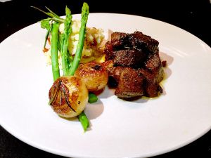 摆盘,先将焯好的青菜放入盘中,再舀一大勺土豆你放入盘中,最后盛一些羊肉粒和小洋葱入盘。淋入一些红酒汁在羊肉粒中,在撒少许的海盐,便可以端上餐桌了。