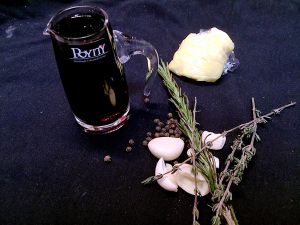羊肉切成方块,蒜瓣拍扁。取一只大碗,放入羊肉粒,倒入60ml红酒,接着放入蒜瓣、2支百里香和半只迷迭香,接着倒入一汤匙橄榄油。用手抓匀羊肉粒和香料,放置一边腌制一个小时。
