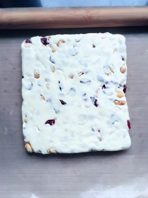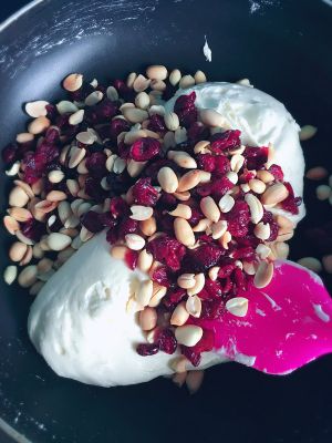 奶粉拌匀后加入蔓越莓干和花生继续拌匀