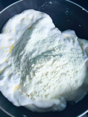 棉花糖融化后关火倒入100g奶粉搅拌均匀