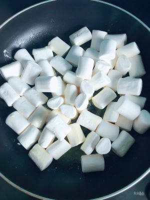 化开的黄油里倒入180g纯白棉花糖,小火加热至溶化