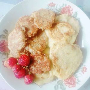 下锅,煎到两面焦黄。(热锅,先放入一小勺面糊,底面煎硬,放上馅,再一层面糊。翻面。)