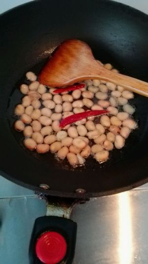 适量油,跟晾干的豆子同时放入锅中(注意,是凉油),再放入些许辣椒,根据自己口味调整,我放了两个,因为我的量少,两个辣椒味道正好