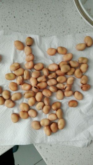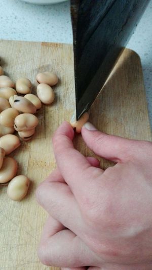 浸泡好后,用刀给蚕豆开个小口
