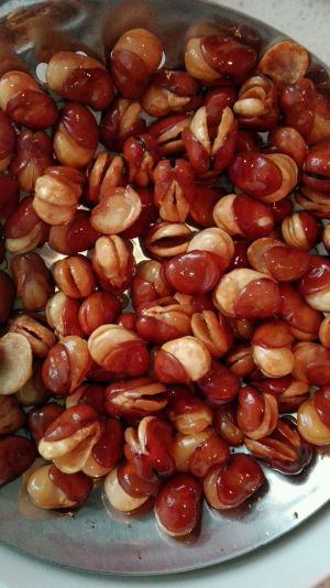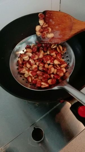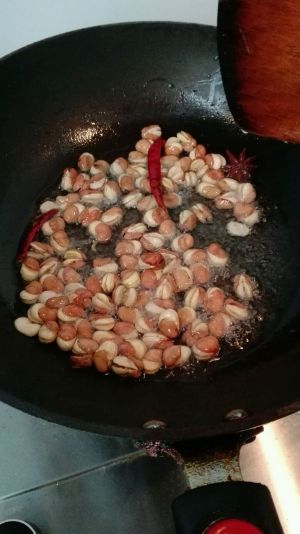 等油温高起来可以再加入一颗八角,提味,这时候可以看到蚕豆的皮正在开裂