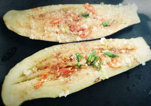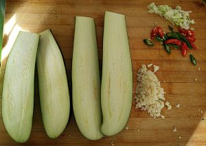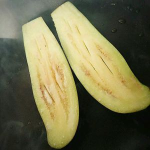准备食材,长茄在选择时候要注意长度跟大小,太长的放不进平底锅。