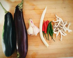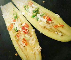 待茄子软一些时候在茄子表面铺上蒜沫、葱、红绿辣椒继续烹,不要担心茄子底面会糊,只要不是大火都没关系。 这时候你可以把蟹腿菇在平底锅周围稍微煎五秒左右,然后夹起铺到茄子面上。