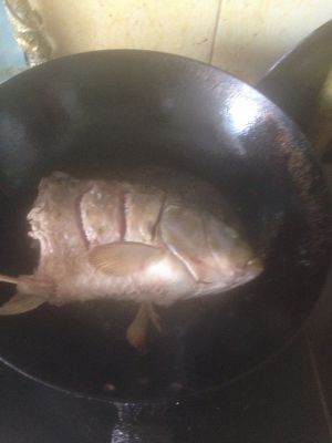 锅中放入油适量加入姜片,提前加姜是为了防粘锅。开始炸鱼,这步要小心慢慢翻动,要不鱼肉会碎掉,两面炸透。表皮略变色即可,一定要鱼身都过油炸。