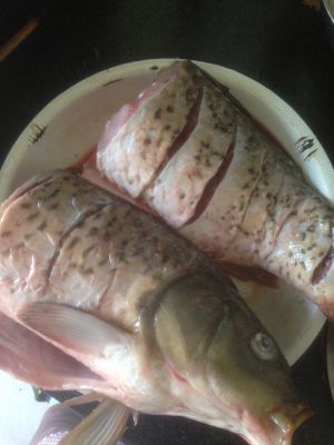 鲤鱼收拾干净去腥线,鱼身两面斜划几刀,方便入味。我买的鱼太大了我分成两半。