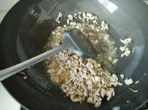加入香菇和芥菜丁煸炒,切记芥菜要切好提前泡的不咸了!如果用竹笋代替也很好!香菇可以多放一点。
