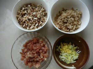 准备好食材,肉 、香菇 、介菜头切丁。葱姜蒜切末。