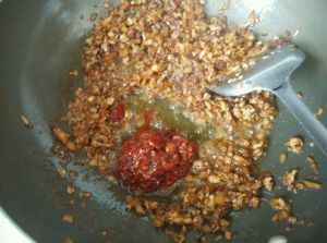 加入一勺胡椒粉,一小勺酱油提味,在放入两勺郫县豆瓣酱继续煸炒。