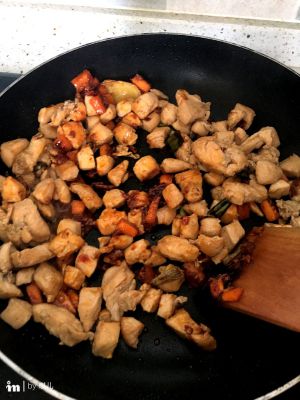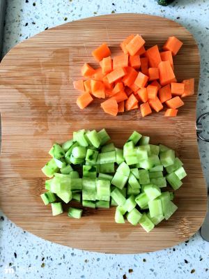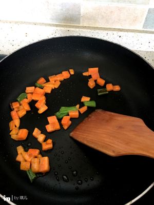 一样滴,还是热锅冷油,加入葱姜爆香,加入胡萝卜丁翻炒~~(我和老公都不太爱吃胡萝卜,所以只切了一点点,不过为了它的营养价值,还是要逼自己吃一点的,哈哈哈,主要是为了配色啦~)