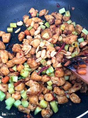 最后一步,加入黄瓜丁和熟的花生米,快速翻炒一下~~