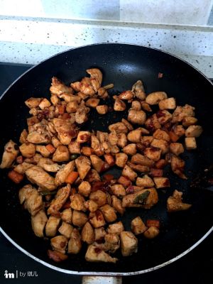 加入之前炒好滴鸡脯肉,快速的翻炒,上色~~(已经很有香味和食欲啦~)