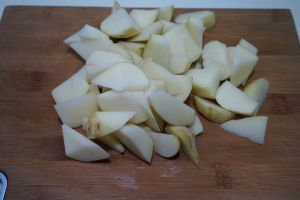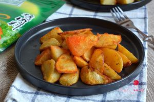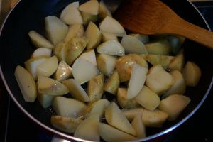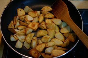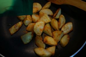 不时地用铲子翻动,使薯块几面都受热,边缘变成金黄色,表面也略有颜色