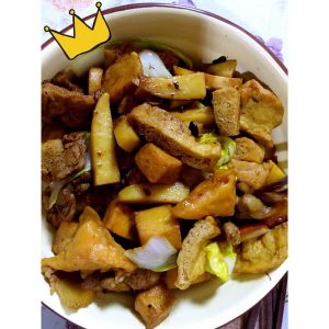 油热后倒入五花肉炒,中火煸干一些,吃起来不会腻,之后放入葱姜,翻炒片刻后加入其他食材,普遍规律是先放不爱熟的,比如肉等,再放容易熟的,比如青菜,炒匀,放入之前做好的酱汁,搅拌均匀即可出锅