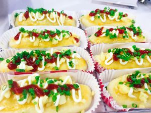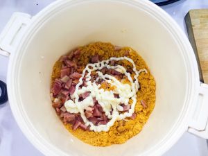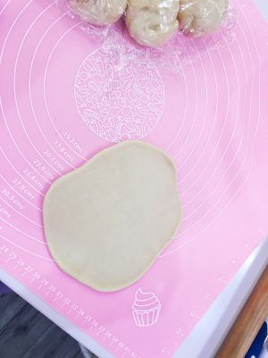 将拌好的馅料放在面饼上(也可以先撒肉松,再放上培根,最后挤点沙拉酱)