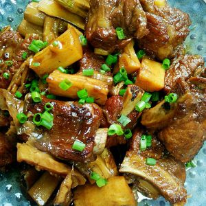 把排骨倒入,用糖炒出来就是这个颜色~,排骨炒的表面微黄,倒入白醋和少量生抽,倒入没过排骨的开水,大火煮开放入笋干然后转小火慢炖
