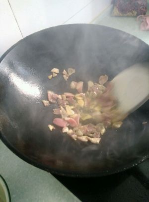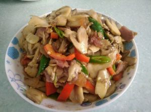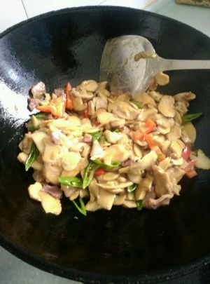 将松茸炒熟后(不要少于十分钟)将火腿辣椒放进去翻炒。