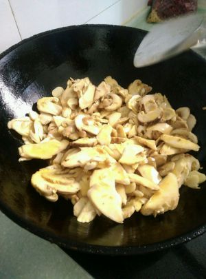 将松茸放入锅中翻炒,也可以稍微油多些用煎的