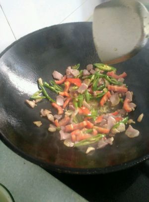 将辣椒们倒入翻炒,炒熟后装盘备用