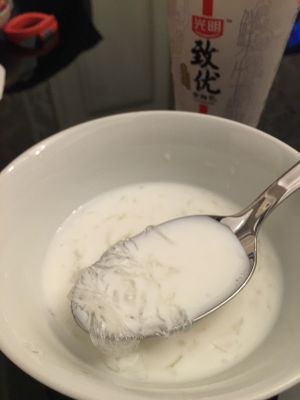 用干净的勺子取出三分之一的燕窝,倒入新鲜牛奶适量就能吃拉。剩下的燕窝待容器冷却后放入冰箱,下次取出吃的时候,可以加入冰糖,牛奶一起蒸10-15分钟