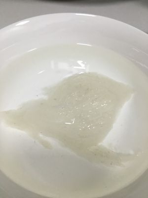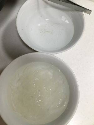 浸完泡发开后,将燕窝撕成小条状,用镊子将其中的燕毛挑掉。中途由于杂质较多,我把燕窝筛过一遍。