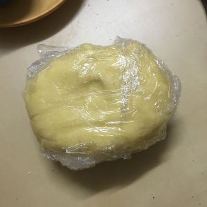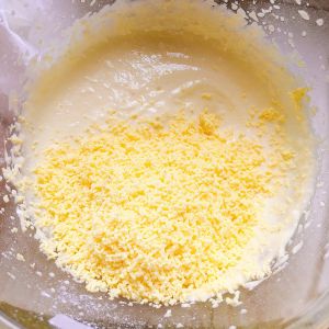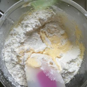 然后筛入低粉+玉米淀粉+奶粉,混合均匀成团。