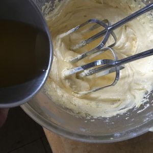 一点点加入玉米油,一边打一边加,每次少量,完全混合后再进行下一次添加。搅打均匀。