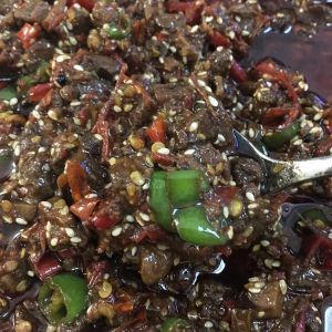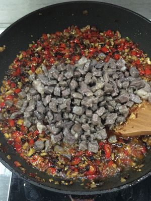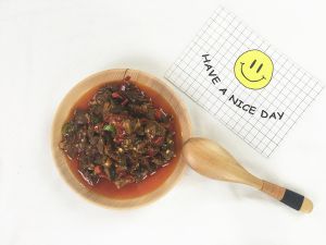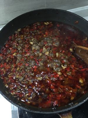 根据自己口味加入盐、糖、蚝油、甜面酱调味,小火熬制2小时,水分熬干后加入新鲜青椒翻炒准备起锅