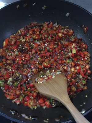 葱姜蒜爆香,加入花椒粒、八角、桂皮翻炒,依次加入郫县豆瓣和新鲜红辣椒和小米辣翻炒均匀出色