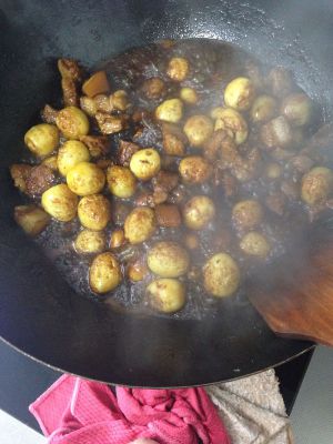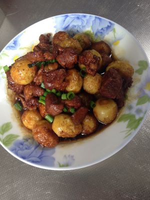 突然想起上传的,已经烧了差不多,过程说一下(五花肉切小块用水小火炖半小时,鹌鹑蛋煮熟后剥皮油炸至金黄,再把鹌鹑蛋倒入烧好的肉中,加冰糖、料酒、五香粉、醋到收干汁)