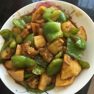 锅里油倒出,剩少量,放入葱末,蒜片爆香,然后倒入青椒块翻炒,放入油炸过的茄子,土豆,倒入勾好的酱汁,加半碗白水