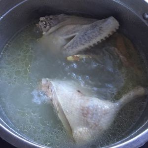 水里加姜片烧开,放入半边鸭,加入两勺米酒。因为我的锅小了点,所以砍成两半。烧开后继续煮25分钟左右。