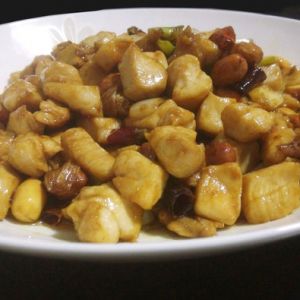 把腌好的鸡丁放入锅中翻炒至熟,倒入备好的料汁