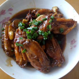 将煮好的翅中捞出,冷水洗净。锅里下油,将鸡翅放入锅中中火煎成黄金色。