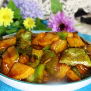锅内留少许底油或者不放油,放葱姜蒜爆出香味后倒入事先调好的汁,待汁粘稠,下炸过的土豆、茄子、青椒,翻炒均匀后稍焖一会儿出锅装盘。